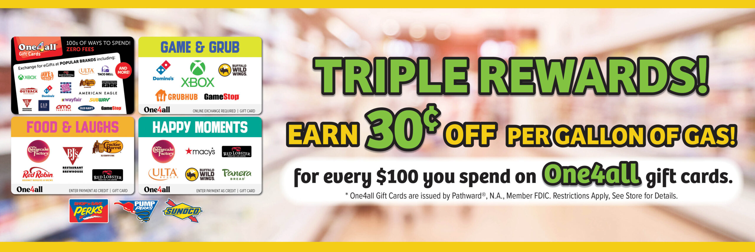 **Subject to change based on promotion. Visa, Mastercard, Gambling, Lottery and Shop ‘n Save gift cards are not eligible for Pump Perks. Selection & availability varies by location. Please check your local retailer.**